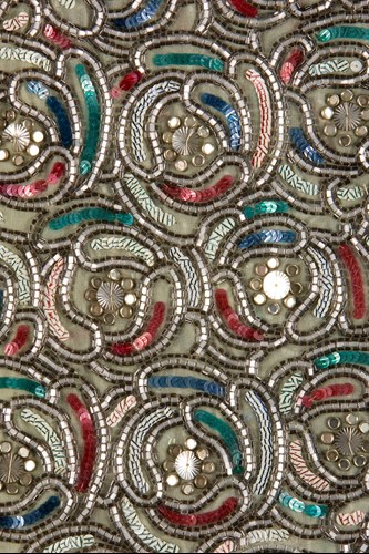 Billedet viser en detalje fra skørtet. Broderiet er professionelt udført i en gentaget rytme af perler, pailletter og similistene i hvidt, rødt, grønt og metal. De broderede former fletter sig ind i hinanden som stiliserede blomster. Foto: Thomas Kaare Lindblad.
