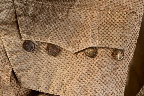 Jeg havde en anden skjult dagsorden for at ønske at se netop den dragt, nemlig at jeg på det tidspunkt arbejdede med udstillingen Sko og Accessories. Mode og luksus i 1700-tallet, som Den Gamle By viste fra marts til og med december 2012. Hvis herredragten havde kunnet tåle det, ville jeg gerne have haft den med i den udstilling. Desværre er den for nedbrudt til at kunne holde til den belastning, og det er helt umuligt at få den til at skinne i sin fordums glans.