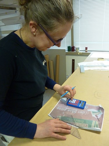 Det er ikke helt let at skalere motiver op til et kæmpe format. Anne Mette bruger lommeregner og lineal, når hun laver mål til skitsen.