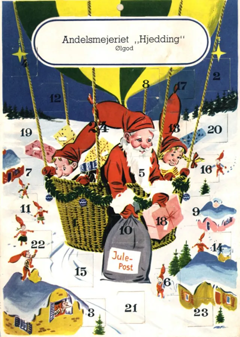 Som det tydeligt fremgår af julekalenderen, er der tale om en reklamekalender. I 1950’erne opdagede forretningsverdenen for alvor reklameværdien af at uddele gratis julekalendere til dens kunder. Reklamekalenderne havde deres højtid i 1950’erne og i 1960’erne, men fænomenet lever videre i bedste velgående.