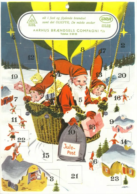 Denne kalender, hvor alle låger har været åbnet, var forsynet med et andet navn i ovalen på ballonen. Julekalenderen var udleveret af Aarhus Brændsels Compagni A/S som reklame! Ikke nok med at vi har et udkast til en dansk julekalender bevaret. Vi kan tilmed nu endeligt dokumentere og én gang for alle slå fast, at vidt forskellige virksomheder gjorde brug af en og samme julekalender i deres reklamefremstød.