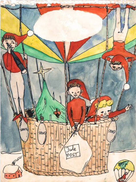 Historien bag selve julekalenderen er, at Elisabeths fader var ansat som driftsleder på Aarhuus Bogtrykkerie, der fremstillede en del reklamejulekalendere. I 1955, da Elisabeth var 12 år gammel, spurgte hendes fader, om hun da ikke havde lyst til at tegne et udkast til en julekalender. Med blyant og vandfarver lavede Elisabeth så denne tegning med de fire nisser med julepost og juletræ i en luftballon over et sneklædt landskab. Ovalen på selve ballonen er til anbringelse af den relevante virksomheds navn.