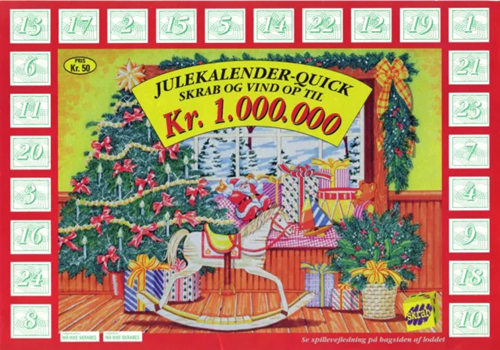 I 1994 introducerede Dansk Tipstjeneste et helt nyt begreb i det danske juleunivers: En skrabekalender. Har man skrabet sig frem til bestemte symbolkombinationer, er der gevinst. Præmiestørrelsen varierede fra 20 kr. (for tre stjernesymboler) til 1.000.000 kr. (for 10 juletræssymboler). Succesen var enorm, og ikke uden grund. Tænk, hvis man vandt en hel million kroner, og så på selve juleaftensdag (- eller måske et par dage før, hvis man sådan skraber lidt i utide)! Alle ved vi jo, at Julen varer længe, koster mange penge.