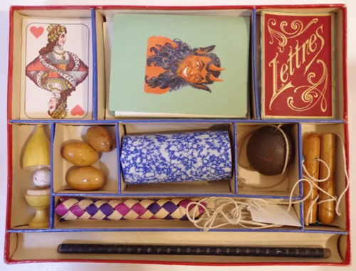 Mekanisk legetøj, ja, men der var også mængder af puslespil, udklipsark, glasplader til laterna magica, opstillingsfigurer, konstruktionssæt og dukkehusmøbler… samt to tryllespil.