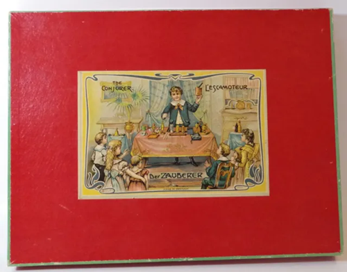 Især det ene tryllespil vakte min interesse, da jeg i 1995 var i færd med at registrere det. Det ligger i en meget fin æske af karton, som måler 28 x 21,5 cm. Forsiden af æsken er forsynet med en herlig farvelagt tegning af en stående dreng bag et bord. På bordet ligger en række tryllegenstande. Tilskuerne til den lille troldmands show, seks børn, ses med ryggen til. Spillet er fremstillet i Tyskland, men et firmanavn er desværre ikke angivet.