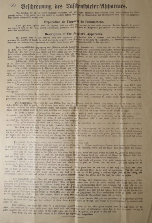 Teksten på tryllespillet er trykt med sort på tre forskellige sprog: Der ZAUBERER, The CONJURER, og L’ESCAMOTEUR, altså Troldmanden.