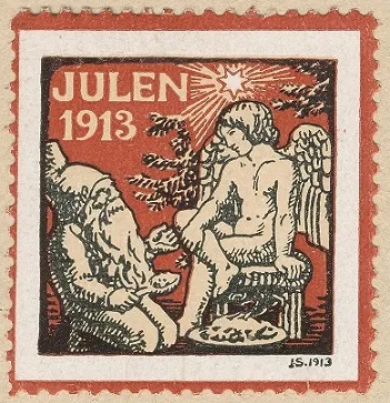 På julemærket fra 1913, tegnet af Joachim Skovgaard, mødes kristendom og hedenskab: Den unge engel sidder og ser på en ældre, knælende nisse, som med slev i hånd er i gang med risengrøden. I baggrunden lyser Betlehemsstjernen over graner. Oplag 8,5 mio. Indtægt 119.988 kr.