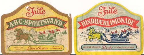 A.B.C. Sportsvand fra Landkær (1896-2011) i Gudumholm og Hindbærlimonade fra Løgstør Bryggeri. Navnet Birk på etiketten til højre refererer til Knud Birk Nielsen, ejer af bryggeriet 1946-75. Samme motiv fra to forskellige mineralvandsfabrikker