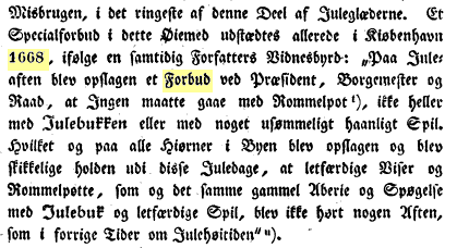 Også i hovedstaden har rumlepotten været flittigt brugt. Måske larmede den lidt for meget i de hellige juledage? I al fald blev det selveste juleaften 1668 forbudt at gå rundt med rumlepotter i byens gader. En plakat udstedt af byens præsident, borgmestre og rådmænd blev ganske enkelt opslået på alle hjørner i byen med et forbud mod rumlepotter, julebukke eller noget usømmeligt, hånligt spil.