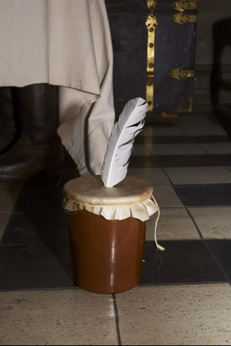 Men hvad er det for en mærkelig krukke, der står på gulvet til højre for julebukken? Det er såmænd en rumlepotte, en slags folkeligt musikinstrument kendt siden middelalderen over det ganske Europa.