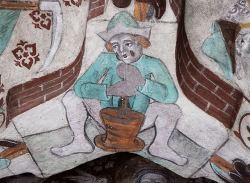 Rumlepotte i brug. Kalkmaleri fra slutningen af 1400-tallet i Härkeberga kirke ved Enköping, malet af den tysk-svenske maler Albertus Pictor
