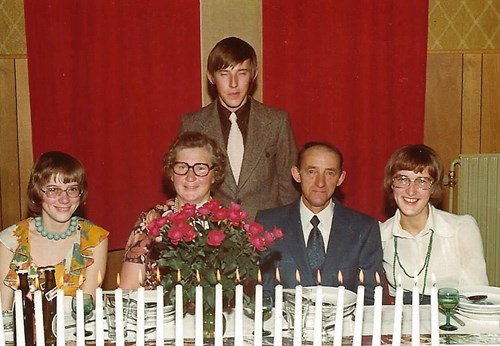 Mariane og Niemann Larsen, der her ses sammen med deres tre børn, fejrede sølvbryllupsfest søndag d. 2. december. Dagen var en af de bilfri søndage, og gæsterne måtte derfor gå eller køre i taxa til morgensangen. Til selve festen, der blev holdt i et forsamlingshus, var der sørget for buskørsel, så mærkedagen blev fejret trods de udfordringer, som oliekrisen foranledigede. Foto venligst udlånt af Gærum Lokalhistoriske Forening og Arkiv.