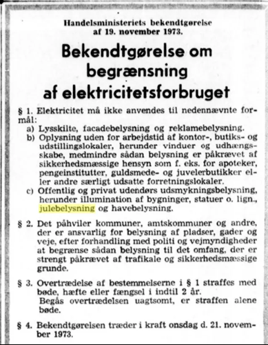 Handelsministeriets bekendtgørelse om brug af elektricitet til bl.a. julebelysning trådte i kraft 21. november 1973.