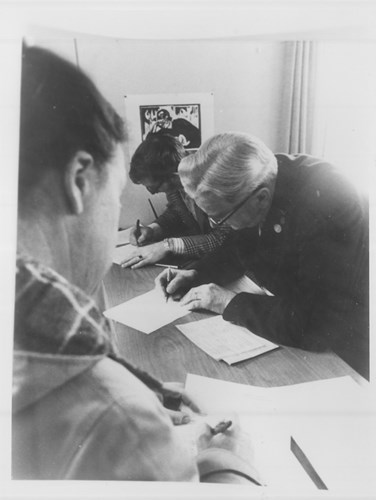 Borgere i Holbæk udfylder ansøgninger til kørselstilladelse på de bilfrie søndage tre dage før de trådte i kraft 25. november 1973. Lillejuleaften var dog undtaget for kørselsrestriktioner, så juletrafikken nemmere kunne afvikles. Foto venligst udlån af Holbæk Stadsarkiv. Fotograf Steen Rasmussen.