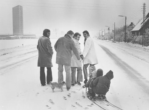 Gåtur på Silkeborgvej i Herning på en bilfri søndag i vinteren 1973-1974. Foto venligst udlånt af Lokalhistorisk Arkiv i Herning. På de bilfri søndage var der god tid til at være sammen med familien, og i Hjørring oplevede man endda en stigning i fødselstallet i september 1974 i kølvandet på oliekrisen. Et af de børn, der blev født var Oline. ”Havde vi ikke haft oliekrise, var hun ikke blevet født”, fortalte Olines mor i Vendsyssel Tidende. Avisen kunne også fortælle om en lignende stigning i Tyskland, men fødselstallene for hele Danmark viser ikke en særlig generation af ”oliekrisebørn”. I 1973 blev der født 72.416 børn, mens tallet var 71.762 i 1974. Tak til Historisk Arkiv Hjørring for lån af avisomtalen.