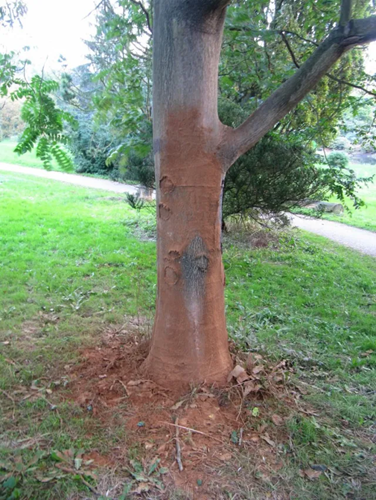 Et træ i Botanisk Have i Aarhus oktober 2015 efter et kanelattentat. Ifølge en nutidig og aldeles forrykt tradition skal ugifte 25-års fødselarer overdænges med kanel. Kanel hører dog til på risengrød og i bagværk. BASTA!