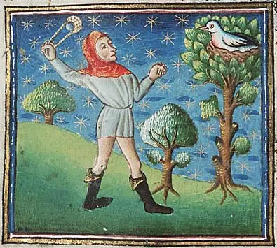 Cinnamologusfuglens rede er opbygget af kanel. Reden skydes ned med slyngens blybolde. Fransk bogillustration ca. 1450. Museum Meermanno (bestiary.ca)