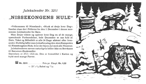 Kalenderen kan derfor dateres til 1944. Men faktisk udkom Nissekongens Hule som alt nævnt allerede i 1943. Kalenderen er nemlig både omtalt og afbildet i firmaet Levisons Heimdal Posten 1943. Her er ordene fra omtalen i 1943:
