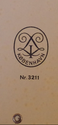 Firmaets monogram og serienummer på bagsiden af julekalenderen. Nederst er den metalring, der holder drejehjulet på plads