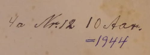 På bagsiden er også to senere påførte tekster med <giverens navn> 4a Nr. 12 10 Aar. samt årstallet 1944.