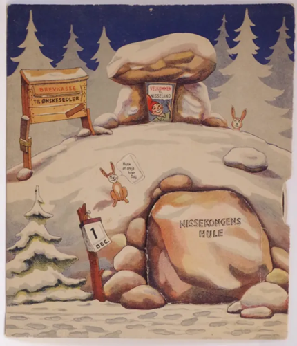 Julekalenderen Nissekongens Hule er en tidlig form for interaktiv kalender. Indlagt i kalenderen er en cirkulær papskive, der kan drejes rundt og rundt. Drejehjulet anes langs julekalenderens lodrette højre side.