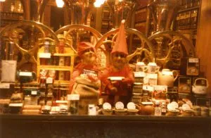 Nisserne i julevinduet hos Frits Hansen Kaffe, Lille Torv 4, Aarhus, julen 1985.
