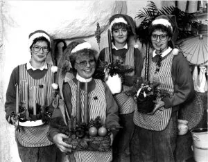 Blomsterdekoratørerne i Clausen Bellis med et udvalg af forretningens bud på advents- og juledekorationer samt kalenderlys ca. 1991. Fra venstre Anita, Birthe Dalstrup, Lykke og Majbritt.