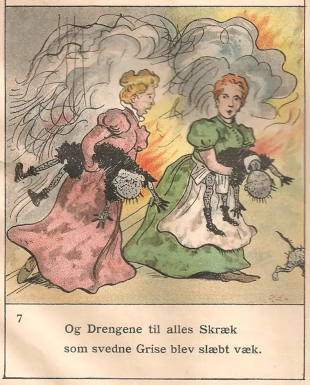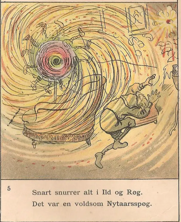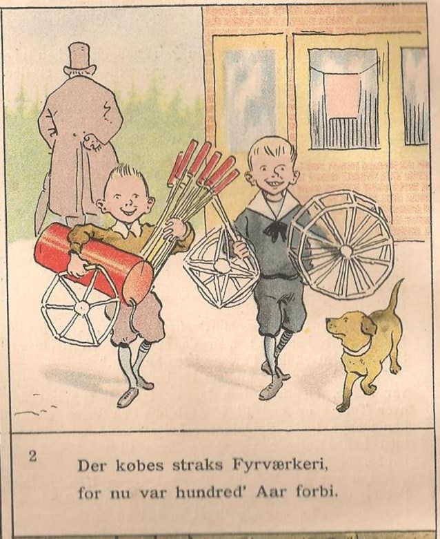 De otte herlige tegninger herunder viser, hvor galt det kan gå, når to forvorpne knægte ganske tankeløst går i gang med at skyde nytåret ind – eller det gamle århundrede ud, som Alfred Schmidt kaldte det.