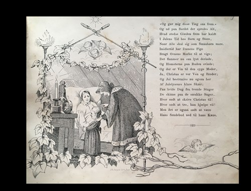 Sidste side i Brevet til Christusbarnet fra 1863, som Otto Haslund og Pietro Krohn lavede illustrationer til.