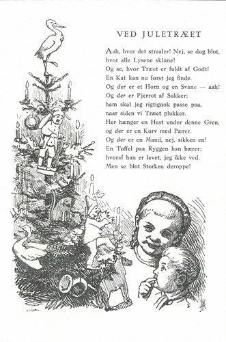 Tegningerne af Peters juletræ i henholdsvis Pietro Krohns originale streg med stork fra anden udgave fra 1870 og Frants Henningsens omtegnede og farvelagte med topstjerne fra tredje udgave fra 1889.