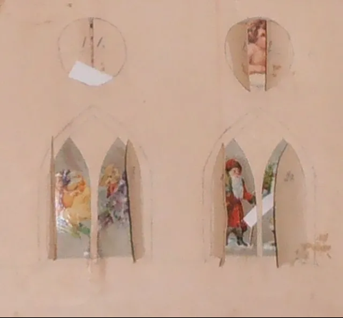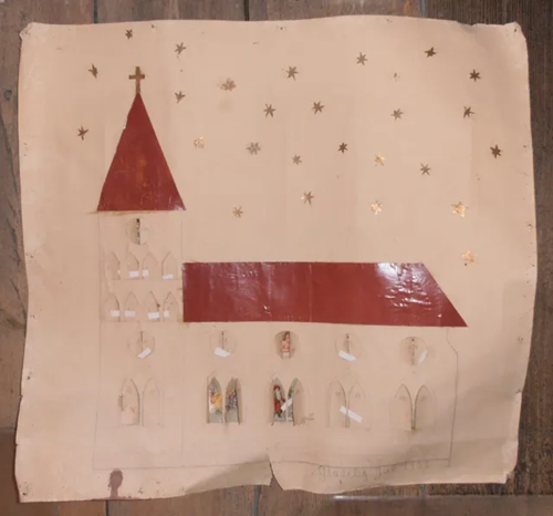 Den hjemmelavede julekalender herover er fremstillet 1932 til giverens farbror af venner af familien. Giver har fortalt, at julekalenderen siden 1932 blev brugt hver jul i mange år, selv efter at familiens fire børn var flyttet hjemmefra. Mange spor efter tegnestifter langs kanterne vidner også om talrige opsætninger af julekalenderen. Dateringen knytter sig til ordene ‘Glædelig Jul 1932’, der med blyant er skrevet forneden til højre under borten på forsiden. Både skibet og tårnet har tage af rødt glanspapir samt spidsbuede og cirkelrunde dobbeltlåger. Lågernes motiver, hovedsageligt engle, er klippet ud af forskellige glanspapirsark. Over kirken er pålimet udklippede guldstjerner. På julekalenderens bagside er limet uregelmæssigt formet blåligt papir, der skjuler lågernes motiver.